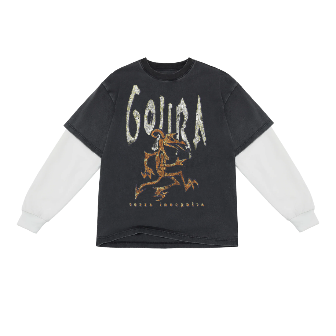This t-shirt features an oversized dropped shoulder fit and sewn white sleeves that create a layered effect. 100% heavy cotton. Front and back prints.